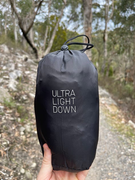 I took off my puffer vest and carried it for a while. I was loving being out on the trail. I was grateful to be out here. However, I was a bit bummed I now had to carry this puffer vest around. I remembered the vest had its own bag you could wrap it up into. I began rolling and squishing and wrapped it up like a tight nugget.
