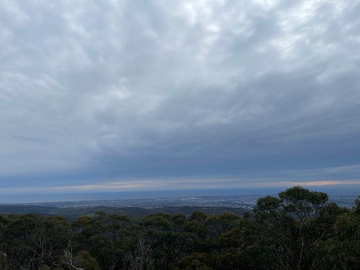 My energy was feeling a little low so I bought an orange Powerade (the best Powerade flavour!) and refuelled looking out across Adelaide. This Powerade was no hot tea in a thermos, but it came in a close second (I’m still yet to purchase a thermos to take on trails with me. I need to get on that!). Ready to set off again I unpacked my puffer vest, put it on and strolled back to the Steub Trail.